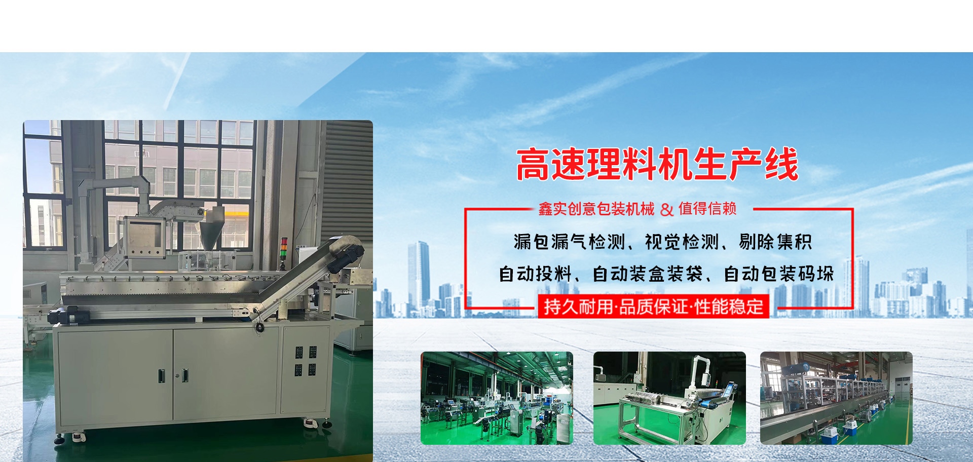 自主研發產品有食品行業:食品包裝機、散包高速理料機、食品高速理料生產線、全自動管材包裝生產線、管材包裝設備、自動折盒機、高速裝盒機、高速投包機、高速散包自動上料機、高速包裝機移動式端封、立式枕式自動接膜機、包裝設備自動糾偏儀、打孔器、真空自動上料機、視覺檢測等多種自動化設;建材行業:直管包裝生產線、蓋帽機、飛行檢測儀等;公司業務范圍涵蓋建材、食品、醫療多個行業,客戶遍及上海、天津、浙江、江蘇、山東、河南、四川、廣西等地。